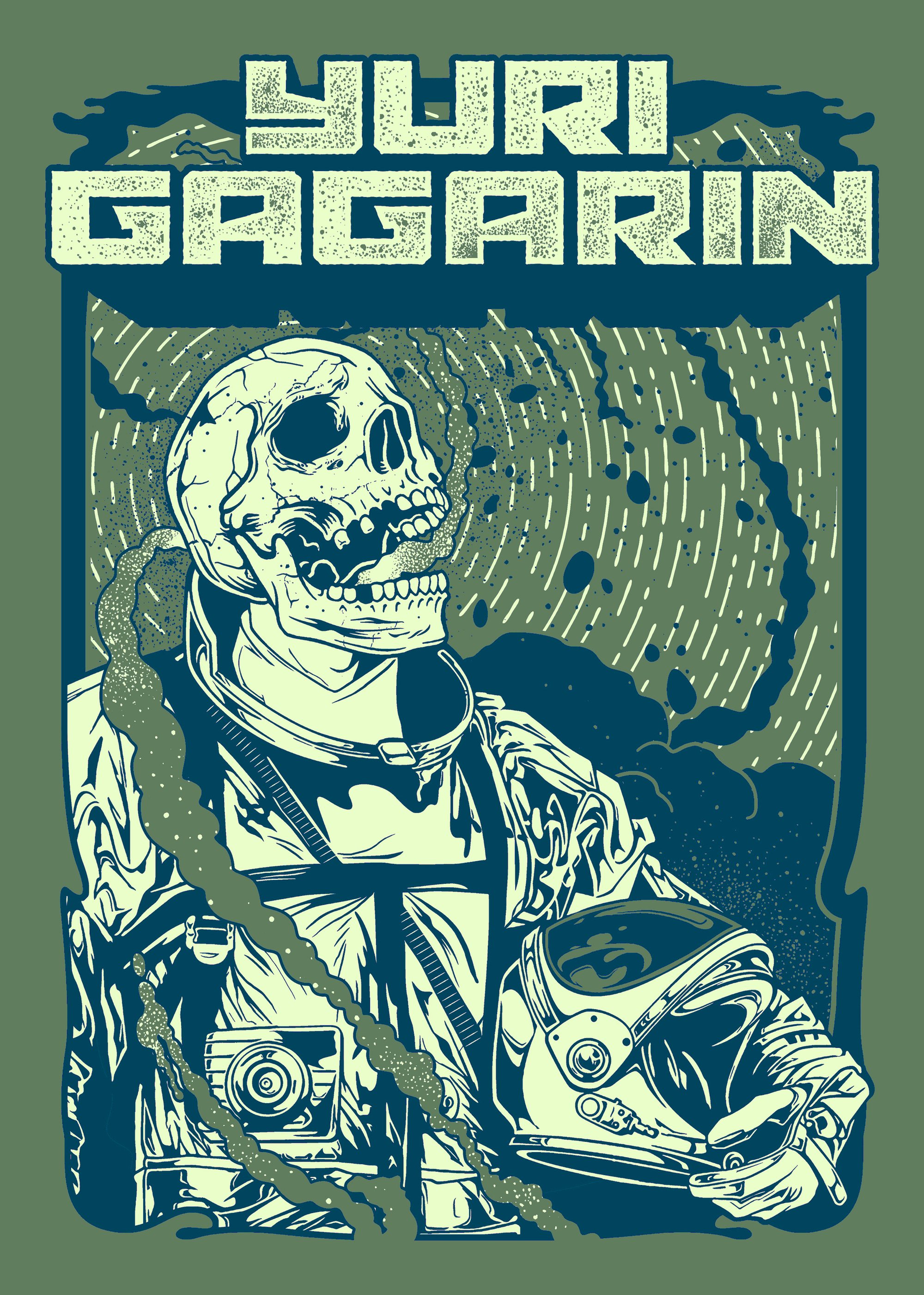 Two-color print on Military Green Gildan Heavy Cotton t-shirt. Design by Diego Valle.