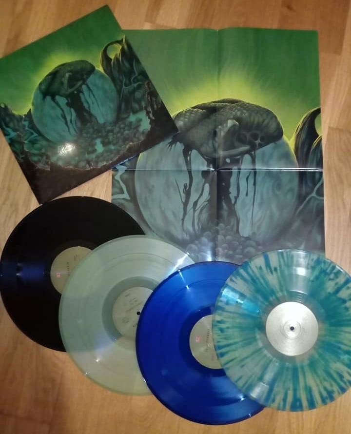 Pale green vinyl with blue splatter. Gatefold sleeve with an A2 poster of the front cover.